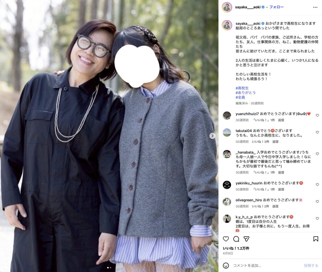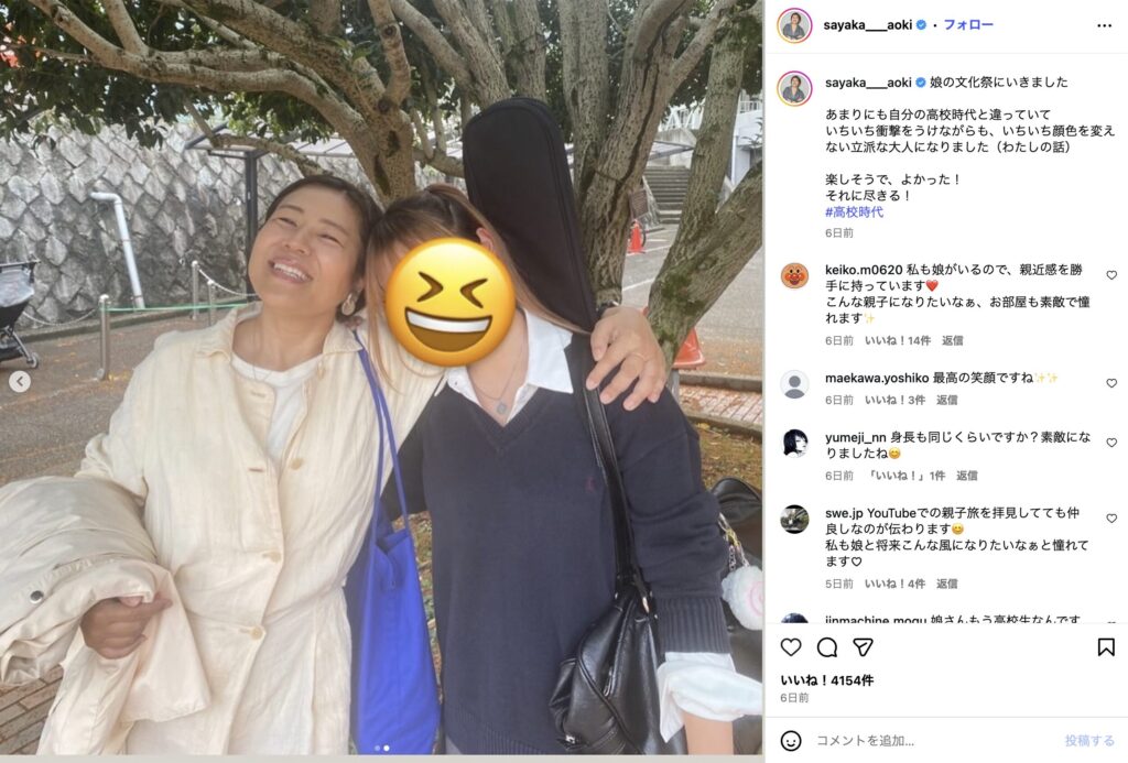 Instagramで「娘の文化祭にいきました」と報告した青木さやかさん。制服姿の高1長女との仲むつまじい親子2ショットを披露しています。「めっちゃいい笑顔」「身長も同じくらいですか?」「素敵な親子」といったコメントが寄せられています。