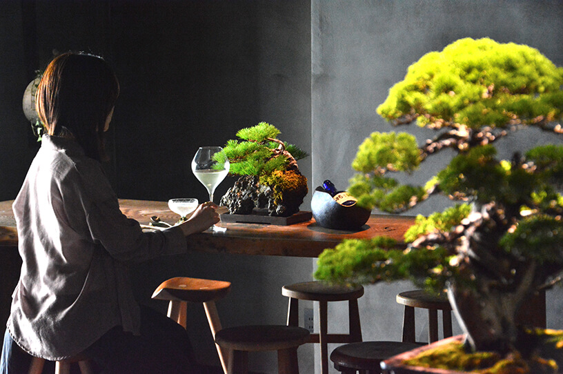 モダンな演出をする松葉屋の盆栽。例えば「明かりを落とした部屋に盆栽をおき、ライティングで際立たせる。必要に応じて飾り台も創作する。」といった、これまでにない見せ方で新たな価値を提示しています。