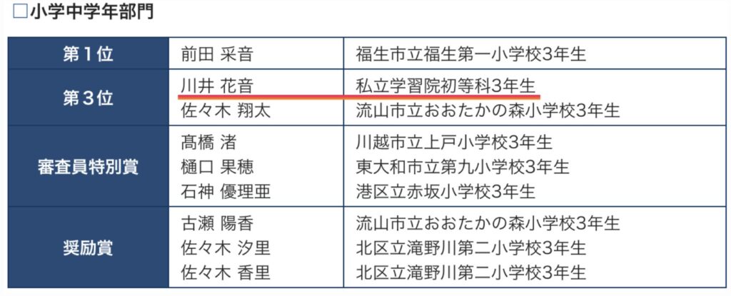 川井花音さんは小学生の頃、ピアノコンクールで入賞しました。コンクールの公式サイトで受賞結果が見れるようになっているのですが、こちらから出身小学校が名門の『私立学習院初等科』であることがわかり、「学習院」のワードが関連づいているようです。