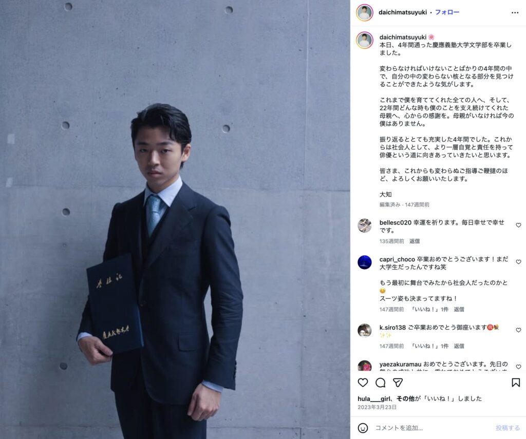 松雪大知さんの出身大学は、『慶應義塾大学 文学部』です。