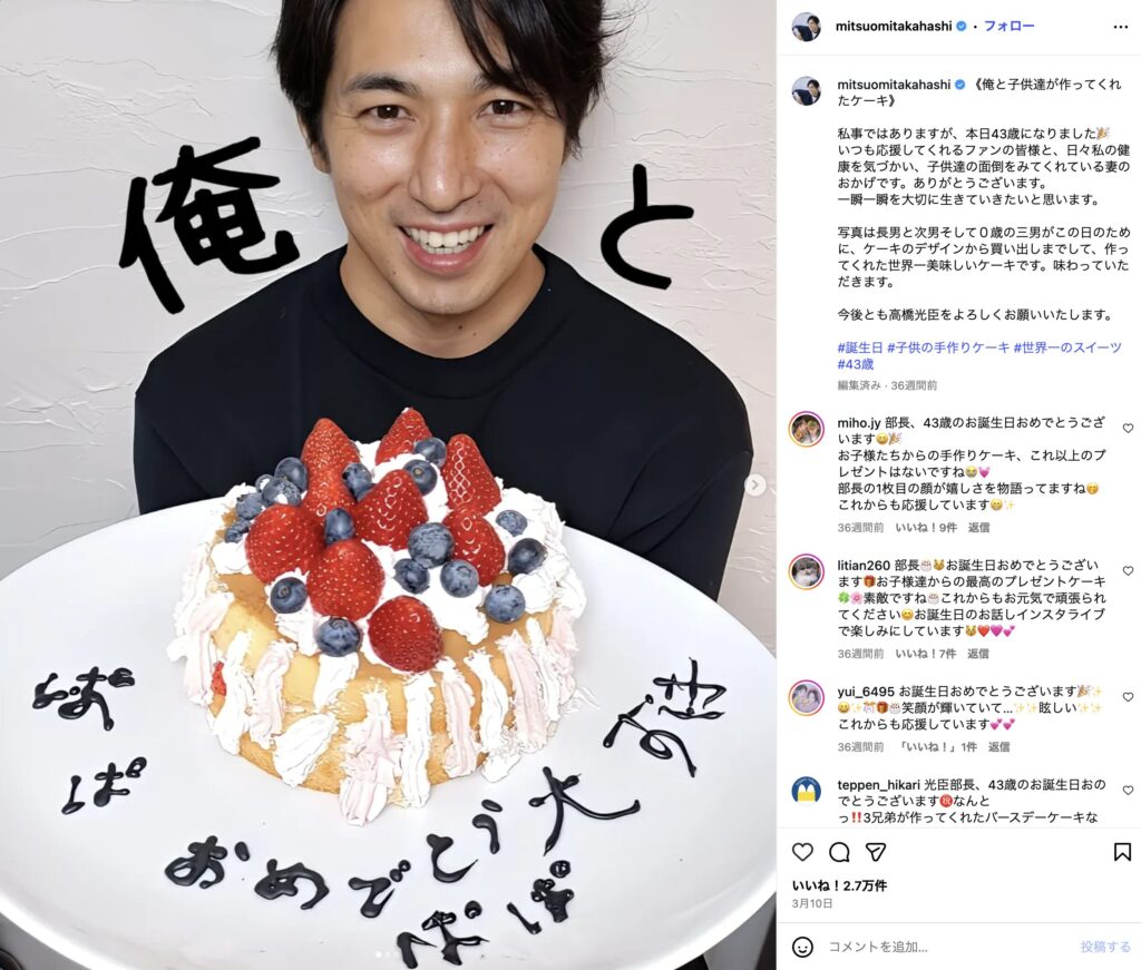 高橋光臣さんは趣味としてInstagramにあげていたスイーツ作りが初・書籍化され、三男の誕生を手作りケーキで報告しました。