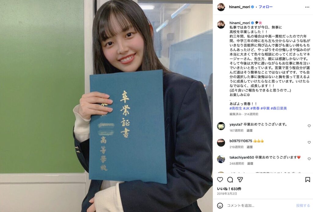 2019年3月に無事、高校3年間・中高一貫で6年間を卒業されたことをSNSで報告しています。