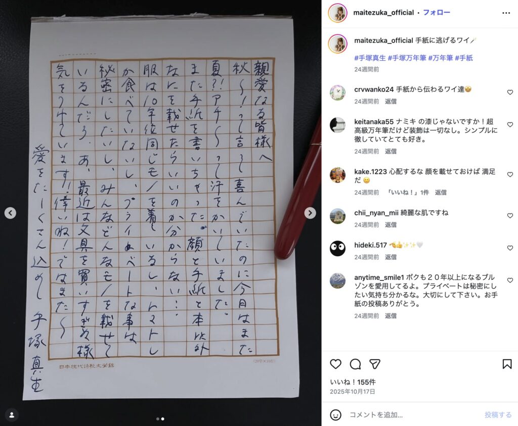 趣味として、万年筆で文字を書くことに情熱を注いでいます。Instagramで、万年筆を使って書かれた数々の書面を公開しており、フォロワーからも高い評価を受けています。