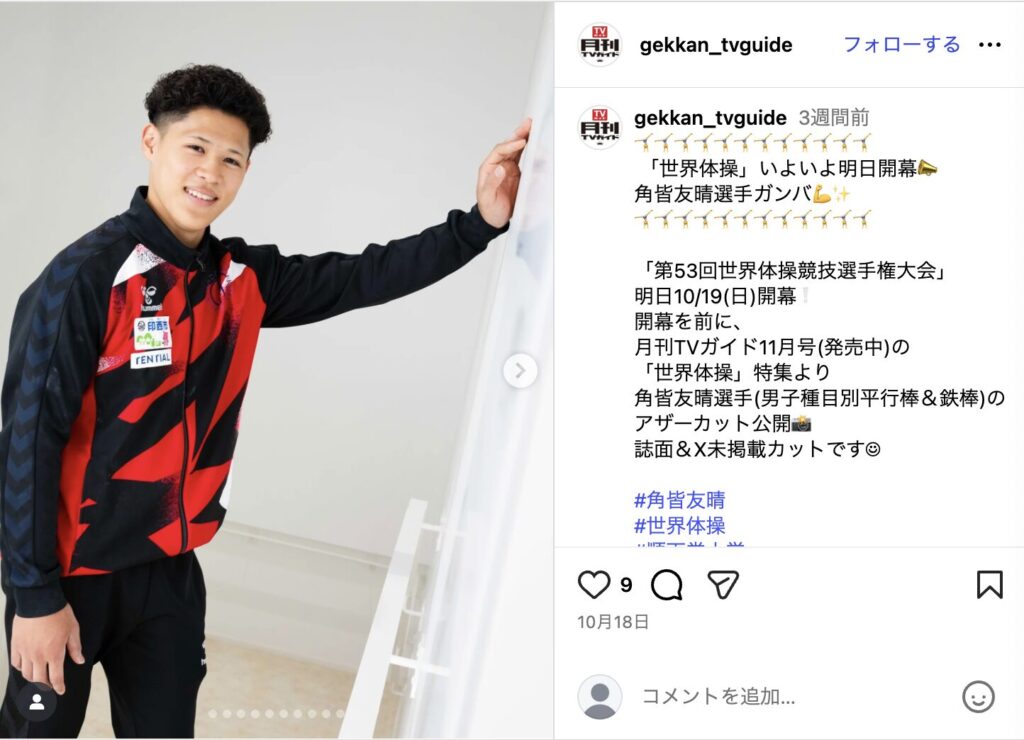今回は2025年4月に開催された全日本体操個人総合選手権で3位に入賞した角皆友晴選手についてです。20代の選手が上位を占めるなか18歳で3位入賞を果たし、先月10月に開催された第53回世界体操競技選手権大会では男子チーム最年少&初の世界体操で、種目別平行棒と鉄棒に出場しました。