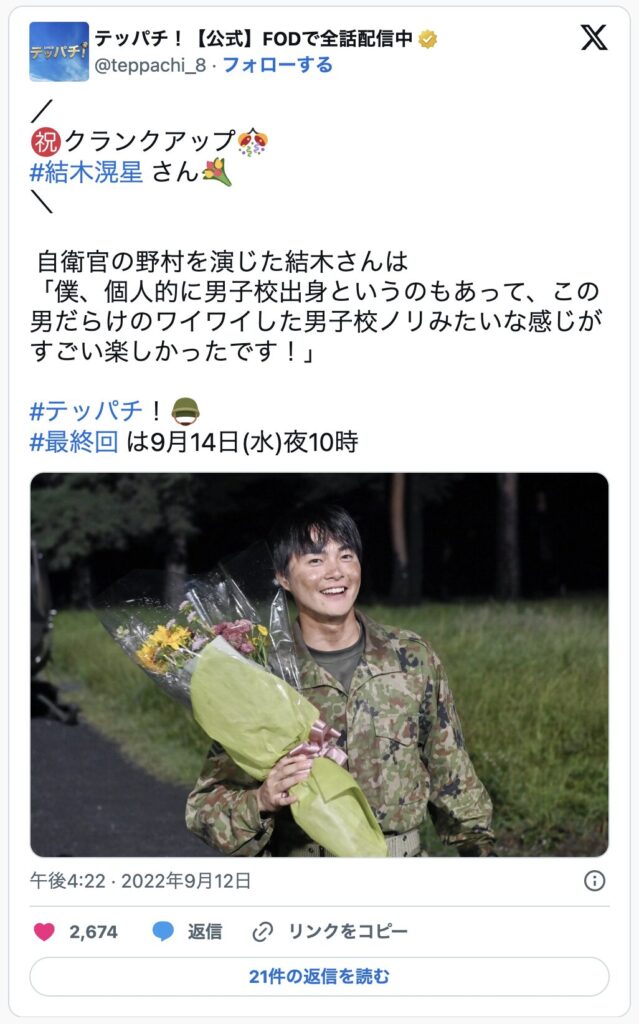 陸上自衛隊を描いたこのドラマで野村晴樹役を演じました。男子校出身の結木滉星さんにとって男だらけの現場の雰囲気活気が楽しかったと語っています。