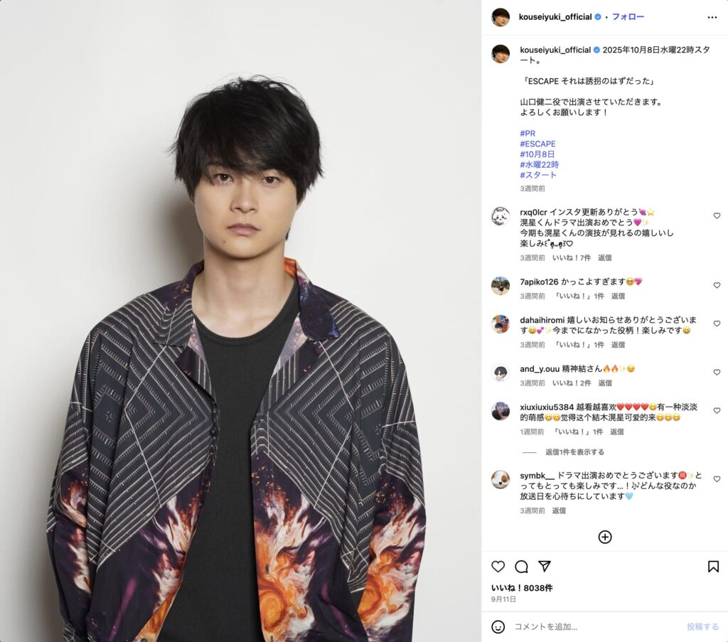 今秋2025年10月8日スタートのドラマ『ESCAPE それは誘拐のはずだった』。誘拐犯グループの山口健二役に抜擢されました。「八神製薬に恨みを持ち、大介たちの誘拐犯グループに加わる1人。交際相手のヒモとして生活している。」という役どころだそうです。結木滉星さんのまた新たな一面が見られそうですね!注目です!!☆